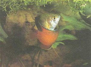 Ну, а где же потомство из домашних аквариумов? Описывая новые мутации, авторы статей всегда подчеркивали, что каждая разновидность фертильна и легко поддается разведению. Я же должен признаться, что не знаю ни одного случая качественного и количественного успешного нереста, например, красного лялиуса. Либо приобретенные в зоомагазине экземпляры вообще отказывались размножаться в аквариуме, либо любители, с которыми я знаком, добивались не лучших результатов, чем я. Однажды в аквариуме зоомагазина я обнаружил среди прекрасных особей лялиуса не уступающие ему по состоянию экземпляры красного мутанта. Все рыбы поступили в одной партии, и красные лялиусы были только немного дороже, хотя и сородичей их никак нельзя было назвать дешевыми. Обладая опытом размножения лялиусов, правда, не всегда результативного, я не мог удержаться от соблазна и решил еще раз попробовать добиться потомства этой прелестной разновидности. У самок красных лялиусов нет слабой полосчатости, присущей природному виду, поэтому отобрать две пары хорошо развитых рыб с «настоящими» красными самками не составило большого труда. Дома я поместил одну пару в 200-литровый аквариум, уже обжитый небольшим числом изумрудных петушков (Betta smaragdina), щучек-панхаксов (Aplocheilus panchax) и сомиков (Ancistrus sp.).