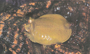 Молодая черепашка Trionyx muticus. Обратите внимание на трубчатые ноздри, которые позволяют черепахе дышать под водой, оставаясь незаметной. Кроме того, кожистые черепахи могут поглощать кислород непосредственно из воды через сосудистую ткань горла (фото Г. Дингеркуса)